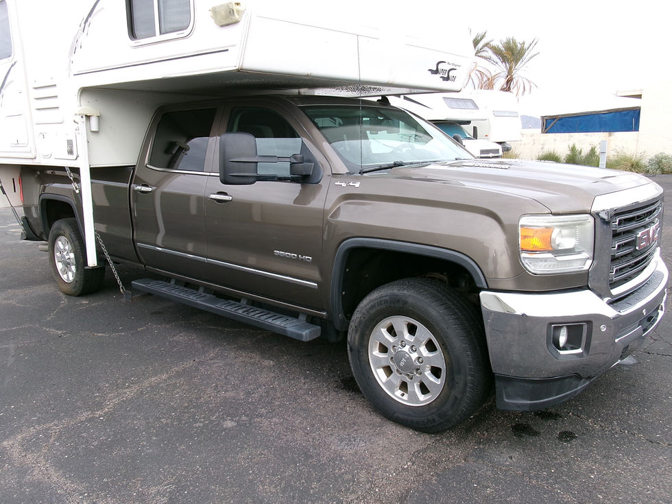 2015 GMC Sierra 3500 SLT Crew Cab 4X4 Duramax Diesel, Single Rear Wheel. Local Trade In. Matching 2020 Michelin Tires with no odd wear. Rear Airbags with onboard remote compressor. It is a light detail away from being as nice as you will find. No known issues. It is exceptionally well optioned. See window sticker photos for options. VIN in photos as well. Clean Carfax. We have the tailgate with the truck when the camper comes off. $29,999.