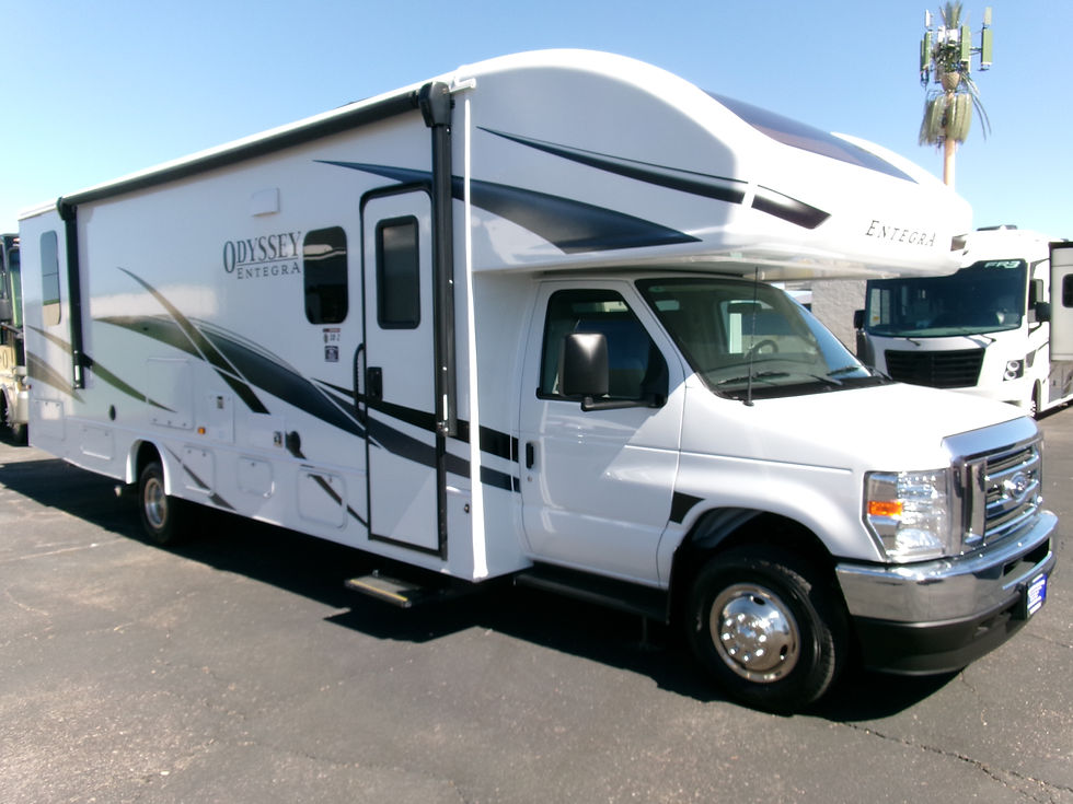 2024 Entegra Odyssey 30Z, 32' Double Slide, One Arizona Owner, Leveling Jacks, Ford V-8, Front and Rear Stabilizer Bars, Hellwig Helper Springs, TPMS, Aluminum Running Boards, Rear and Side Cameras,18' Power Patio Awning, Slide Topper Awnings, One Piece Fiberglass Roof, One Piece Front Cap, Front Cap Window with Power Shade, Frameless Windows, Sony Infotainment Center, LED Smart TV, Bedroom TV, Exterior LED Smart TV w/Marine Speakers, Winegard 2.0 Wi-Fi 4G Antenna, 4,000 Watt Generator, 30 Amp Service w/EMS, Two Ducted Roof AC's, 1,000W Inverter, Outside Shower, Filtered Water, LP Quick Connect Hookup, Swivel Front Seats, Power Mirrors, Power Windows and Locks, Keyless Entry, 84" Ceiling Height, LED Lights, Ball Bearing Drawer Guides, Mid TV and Electric Fireplace/Heater, Optional Theater Seating, One Solar Panel w/Regulator, 10 Cu. Ft. 12Volt Refrigerator, Range and Oven, Over the Range Micro/Hood, Pop Up Charging Station, USB Charging Ports, Wireless Chargers, Heated Holding Tanks, Gas and Electric Water Heater, Glass Shower Door, Porcelain Toilet, 7,500 lb. Hitch, Black Tank Flush, 4,731 Miles. Clean! $99,999